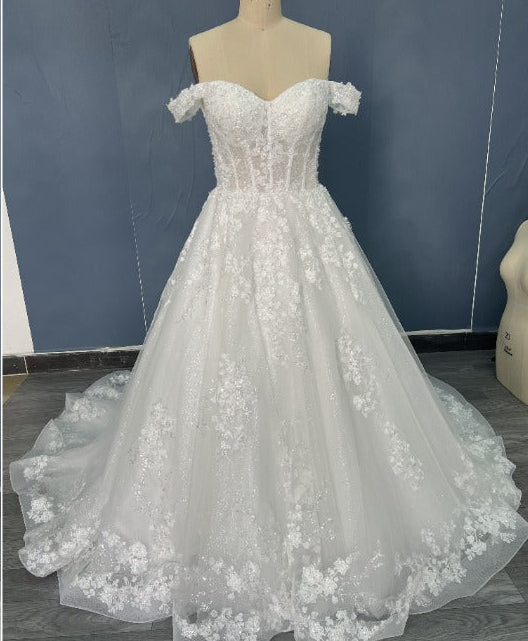 Πριγκιπικό νυφικό με γκλίτερ στράς και δαντέλες.
